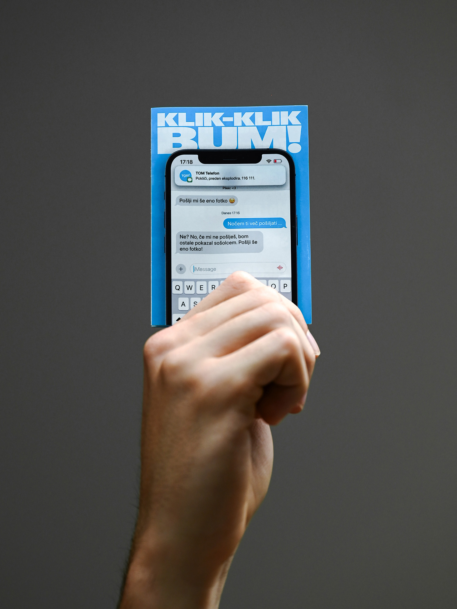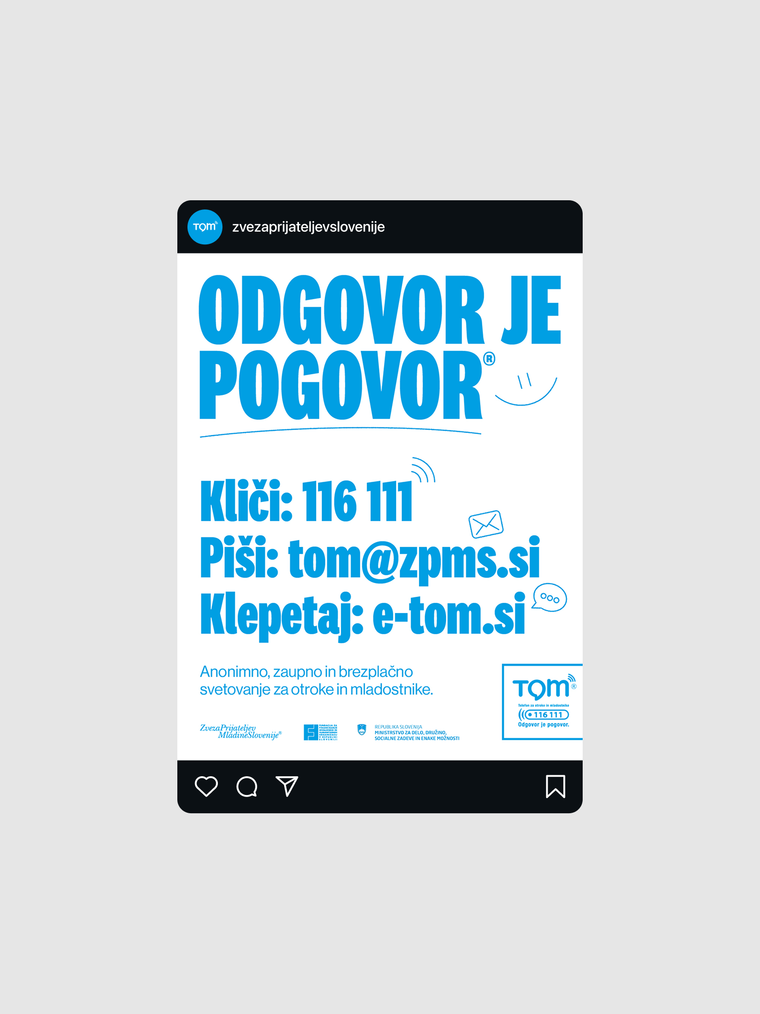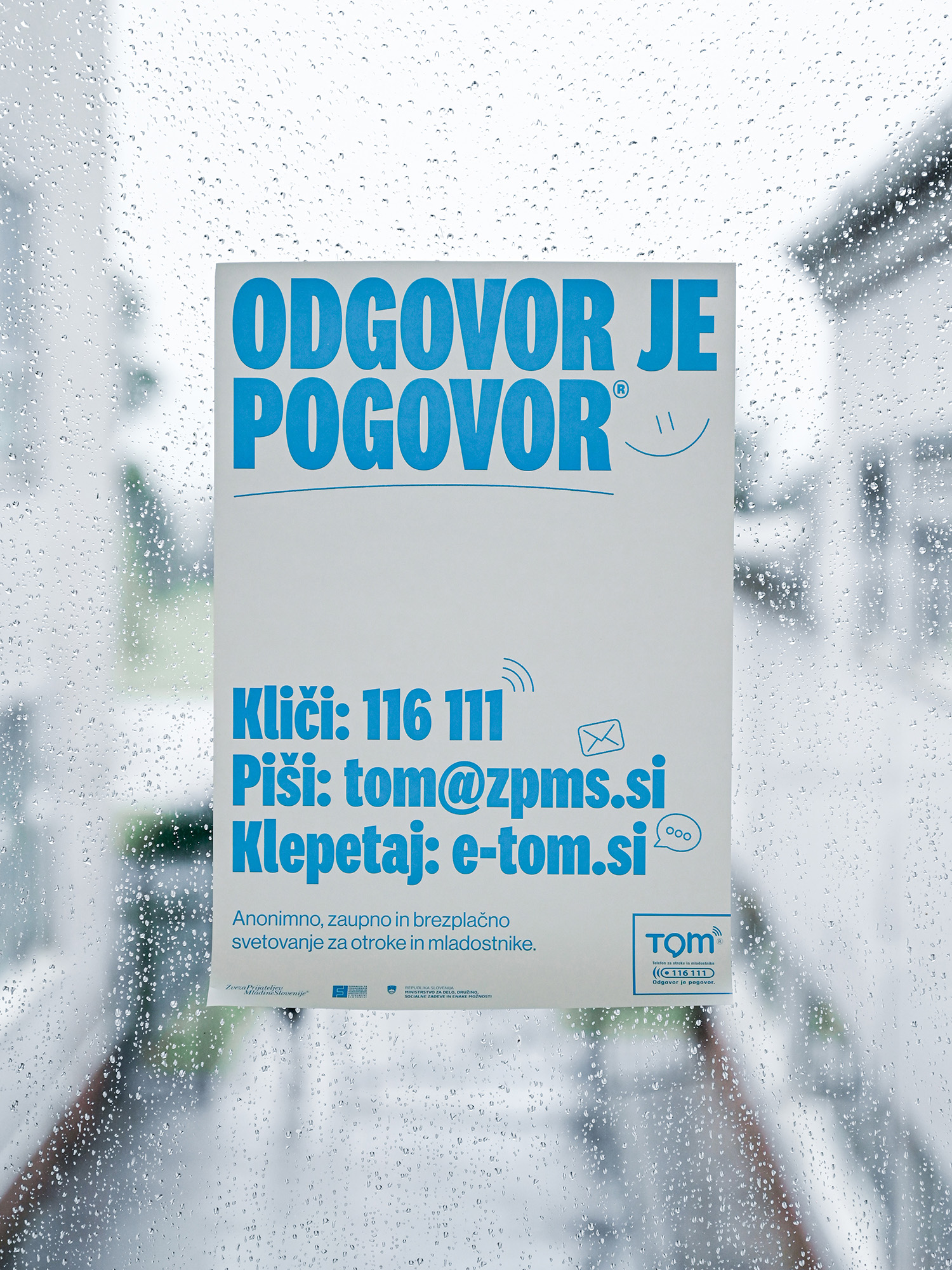 The project was commissioned by ZPMS (Zveza Prijateljev Mladine Slovenije), who approached us with the challenge of creating a unified communication campaign divided into two parts: the first focused on promoting the TOM helpline, and the second on raising awareness about the dangers and consequences of sextortion among young people. Both parts had to be connected through a shared visual identity and a clear call to action: to reach out to TOM when in need of help. The key difficulty lay in addressing children and teenagers who are at a transitional age: developing, asserting independence, and striving to appear “grown-up.” The message had to be serious and trustworthy enough to gain their respect, yet still warm, friendly, and relatable. The campaign needed to inform about TOM’s anonymous, confidential, and free support, while also warning about the increasing threat of sextortion without using fear or shame as tools.