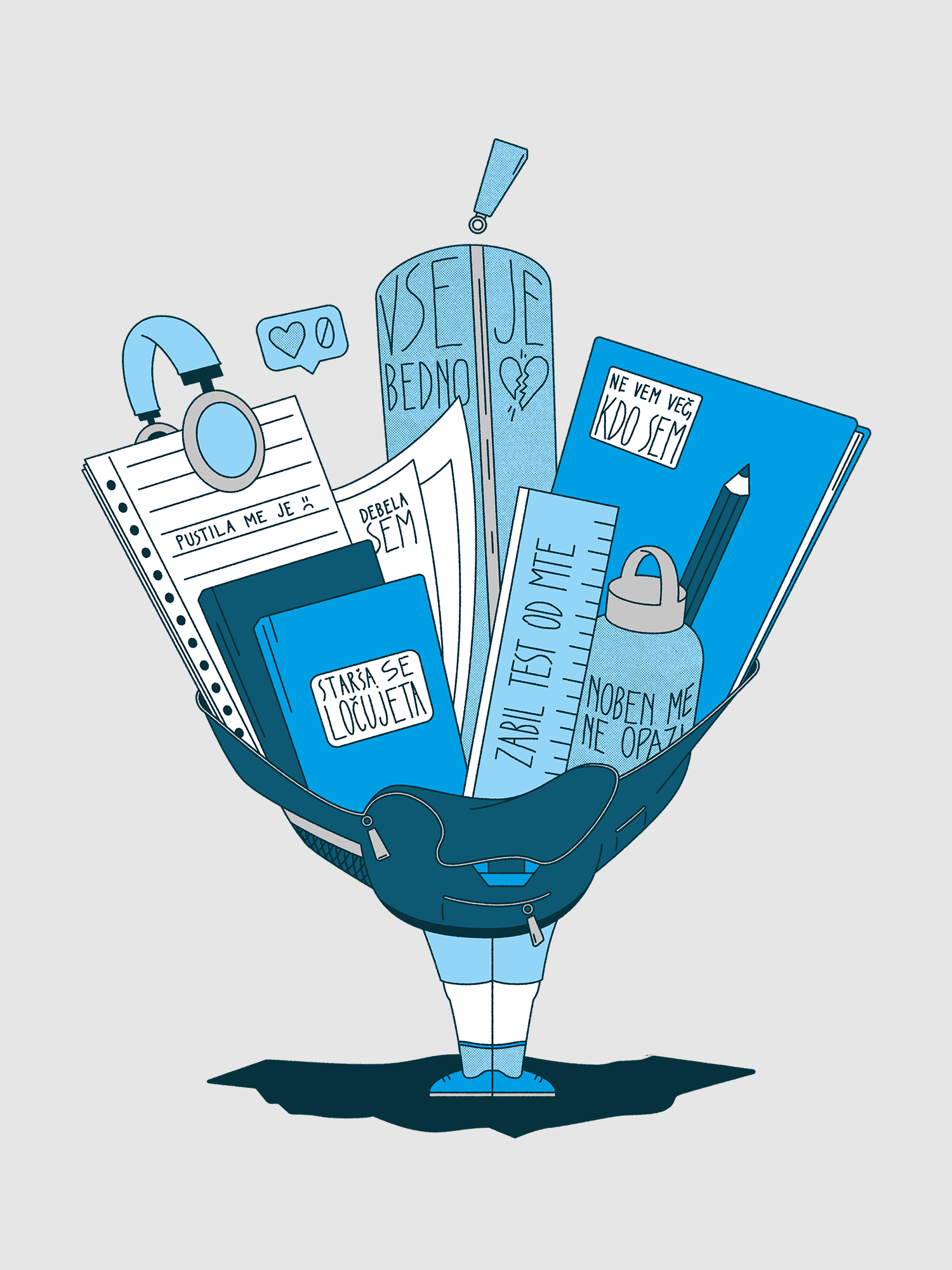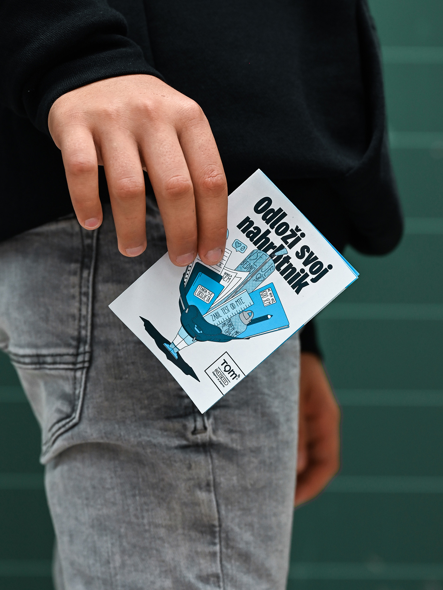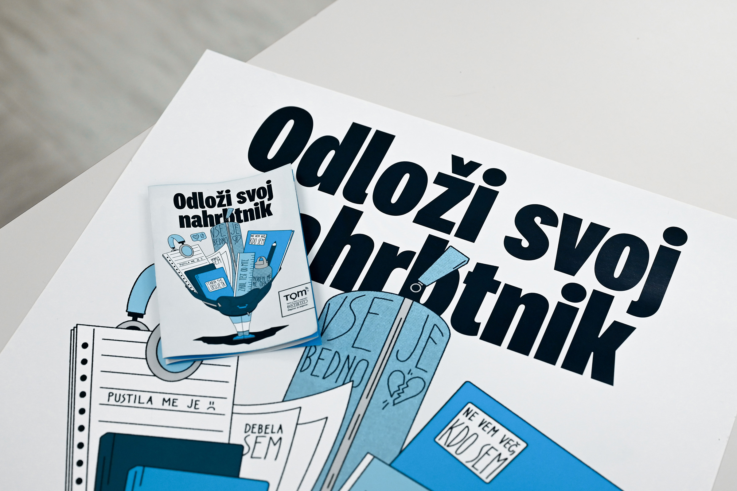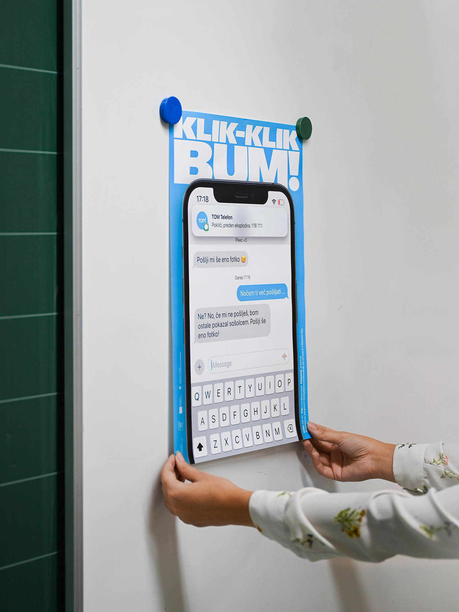 The campaign resulted in a coherent visual and narrative system that connected all materials under one recognizable identity. The three core posters formed the backbone of the concept. The informational poster communicated TOM’s values such as simplicity, trust, and warmth. They were expressed through soft, bold typography, TOM’s signature blue color, and notebook-like hand-drawn illustrations that reflected familiarity and approachability. The creative TOM poster carried the message “Odloži svoj nahrbtnik” (“Put down your schoolbag”), visualizing the emotional weight many young people carry — from bullying and heartbreak to family struggles — and positioning TOM as the helping hand ready to listen. The internet safety poster, made for CVI (Center za varnost na internetu), focused on the topic of sextortion. A smartphone served as the central element, visualizing how quickly a seemingly harmless interaction can turn dangerous. The striking typography “Tic, tic, BOOM” underlined the sense of urgency and immediacy, while the message pointed directly to TOM as the lifeline for anyone caught in such a situation. To ensure coherence across all materials, we connected the two TOM helpline posters with a unified logo lockup, and used the signature TOM blue throughout the entire campaign. That tied all print and digital formats together into one recognizable, consistent story. This way, each piece could stand on its own, yet when viewed together, they formed a complete ecosystem of trust, awareness, and support.